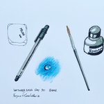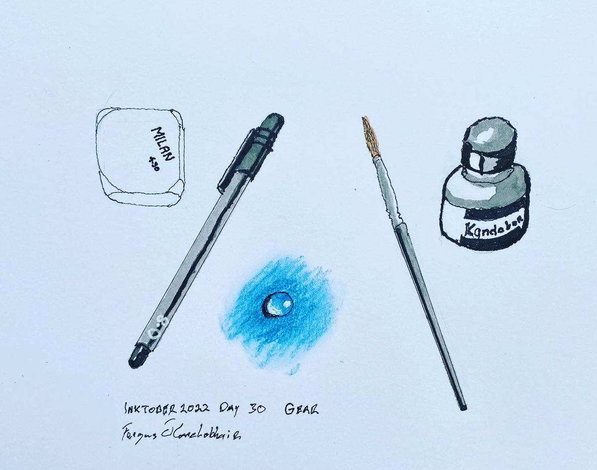 31st Inktober challenge Gear. Ink, Pen,rubber, brush and a drop of water. Actually a pencil and two small jars of water. To plagerise Magritte. Ceci n’est pas un goute d’eau. This is not a drop of water. #inktober2022gear #inktober2022 #fergusoconchobhair #drawing #penandink