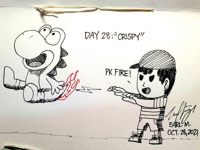 Day 28: "Crispy" Ness doing what he does best, setting things on fire 😅 We here at WEarld of Art don't condone violence against dinosaurs 👍 #inktober #inktober2021 #crispy #SuperSmashBrosUltimate #ness #yoshi #pkfire #art