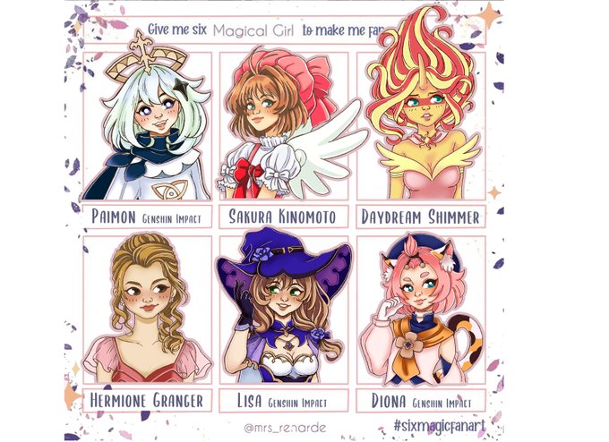 Finally finished the #SixFanarts #sixmagicgirls #SixFanartsChallenge ! ❤️❤️❤️thank you everyone for participating! We ended having some of #genshinimpact gals, like #lisa #diona #paimon #sakurakinomoto #daydreamshimmer and #hermionegranger