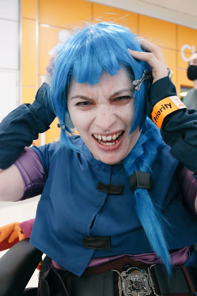 @shimmerforbood No problem, Pow-Pow approved! @arcaneshow @riotgames @LeagueOfLegends #PowderIsTheBESTArcaneCharacter #Cosplay #Arcane #DisabledCosplayer #WheelchairUser 💙🎆🐒🥺