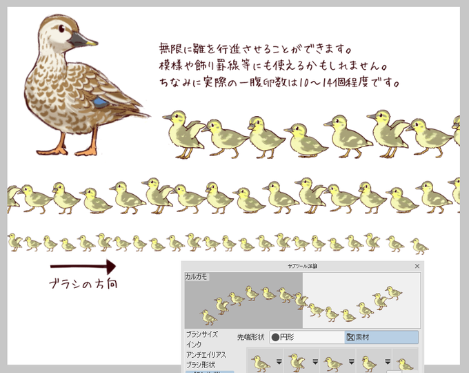 【カルガモの行進ブラシ】 また変なブラシを作ってしまいました。でも意外と模様や飾り線的にも使えるかもしれません。よろしければお使いください。(無料です) assets.clip-studio.com/ja-jp/detail?i… #愛鳥週間