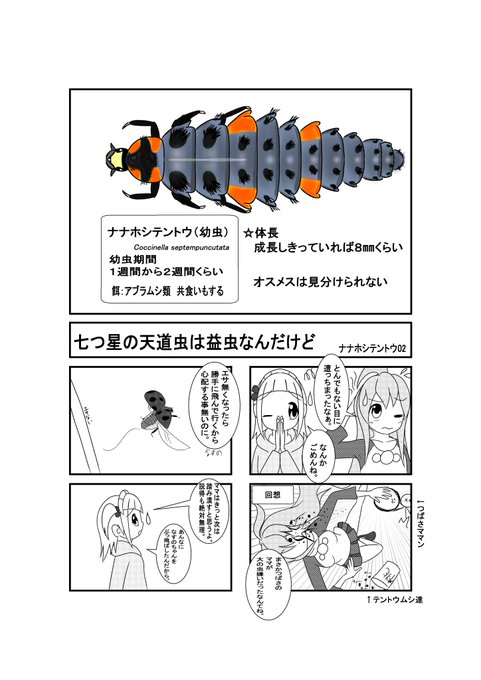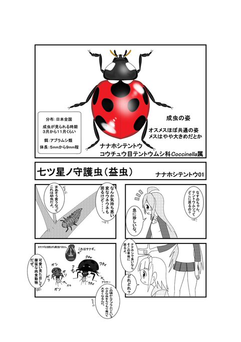 ちょこっと大図鑑 第3話 七つ星の天道虫は益虫なんだけど ナナホシテントウ02 この話までは試験的な構成やキャラデザになることに留意。あと不定期更新 #ナナホシテントウ #漫画が読めるハッシュタグ