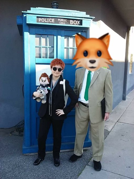 Me as Crowley with my furry brother Kei Fox in front of the TARDIS at Geeky Teas in Burbank We went for a Dr. Who craft fair a few weeks ago, was fun but small @neilhimself @michaelsheen #GoodOmens #Crowley #demon #cosplay #DrWho #TARDIS #geekyteas #Burbank