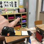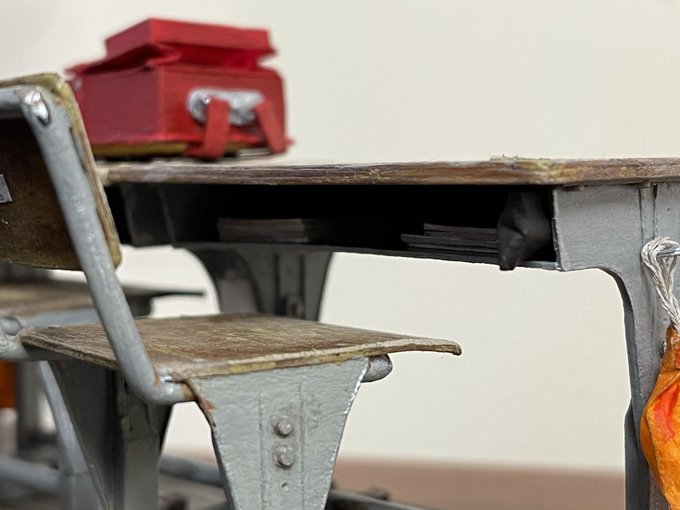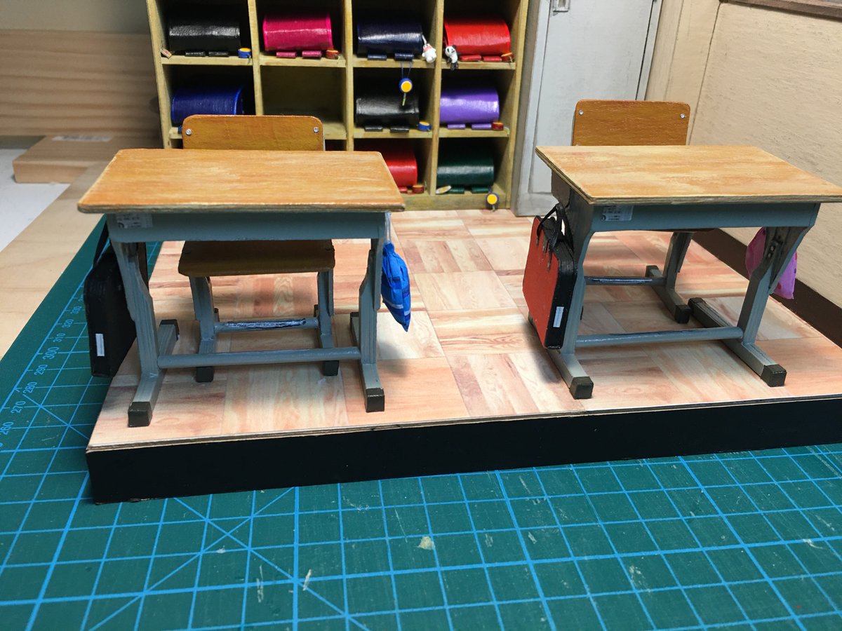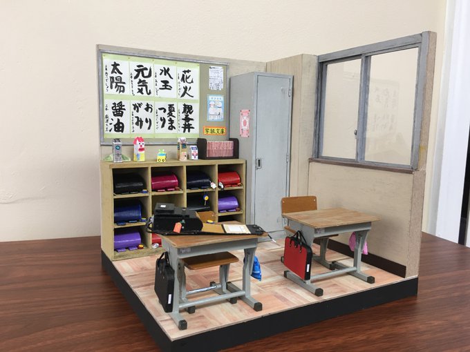 閉じたランドセルをロッカーに入れて、ランドセルにつけるフィギュアを作って、机を配置して、開いたランドセルを机に上に置きました。 #自作模型 #ミニチュア #ペーパークラフト