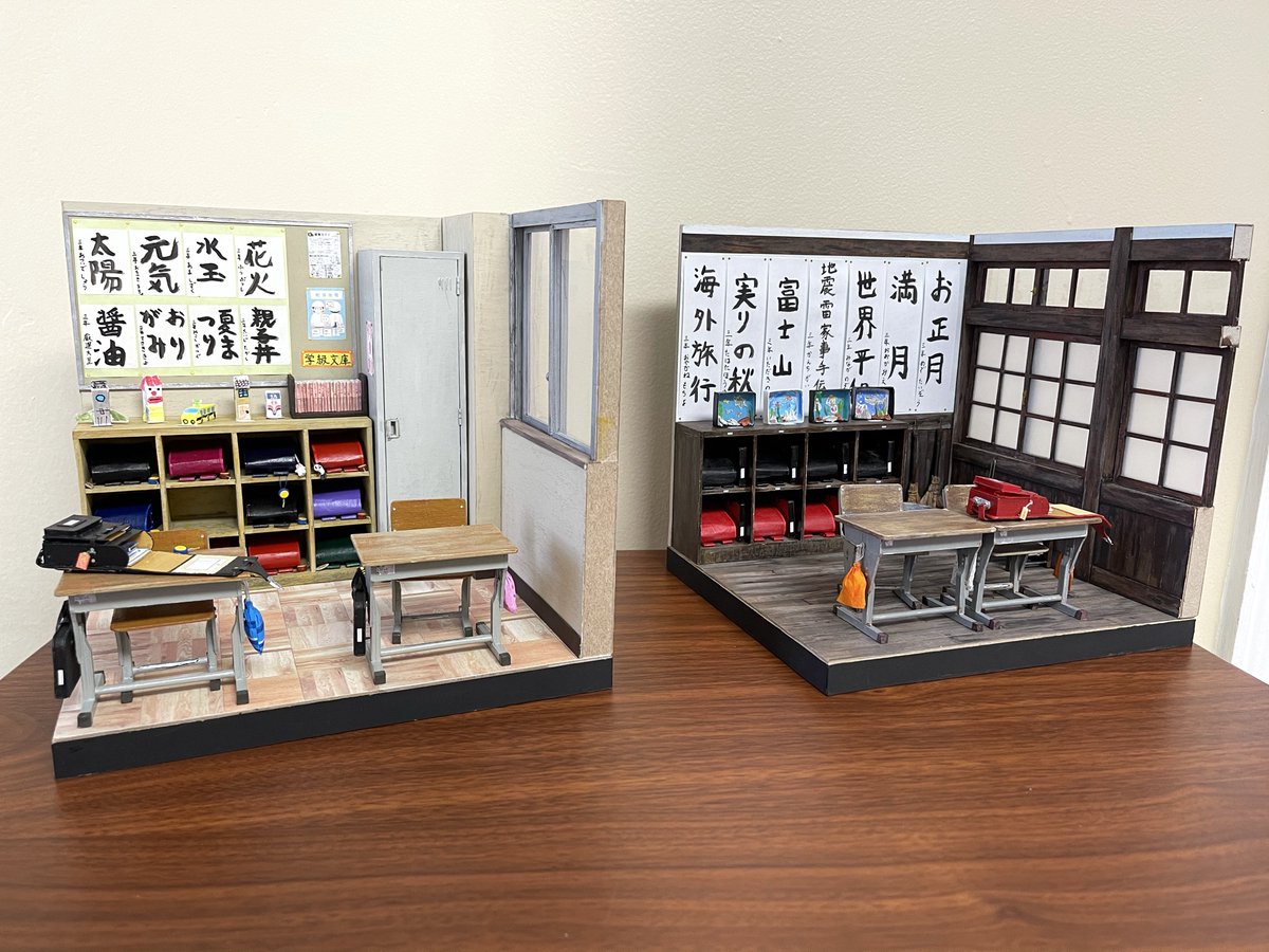 80年代日本の小学校の教室 完成 その6 1/10サイズで大きさはこれくらい。 以前作った『最近の小学校の教室』と比べてみました。 #自作模型 #ミニチュア #ペーパークラフト