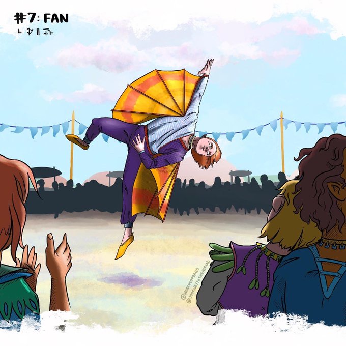Day 7: Fan! Almost forgot to post this here. I'll be honest, Inktober this year is wiping 💀 me 💀 out 💀. Anyway, here's a Kirelik Wing Dancer, a cultural staple at every Skirthen festival. #inktober2021 #inktober #inktober2021day7