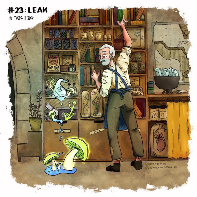 Day 23: Leak! Tibar collected many odd specimen in his study from his years of travelling as an archiver. One of which was water from a potent magical lifepool; which up until today had been stored in a decidedly leak-free container. #inktober2021day23 #inktober2021 #Inktober