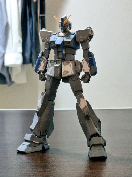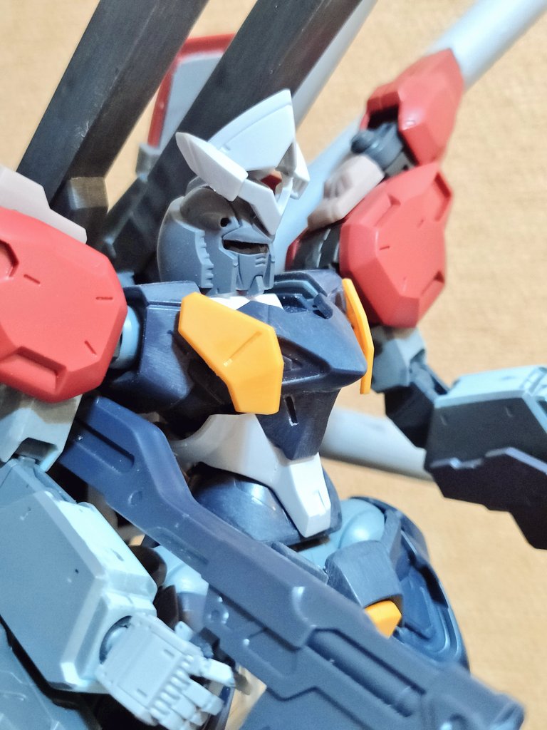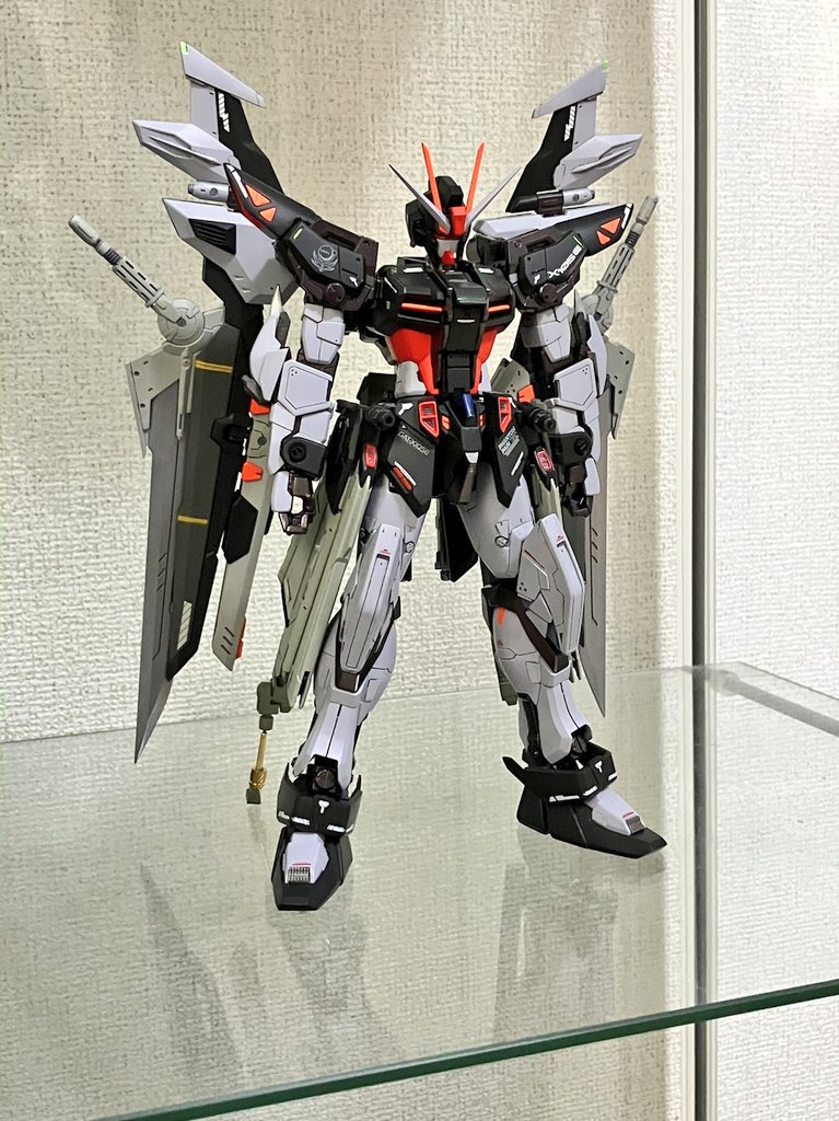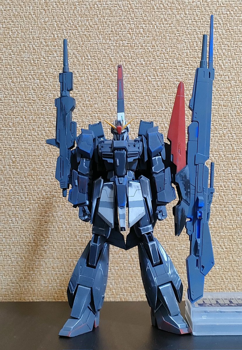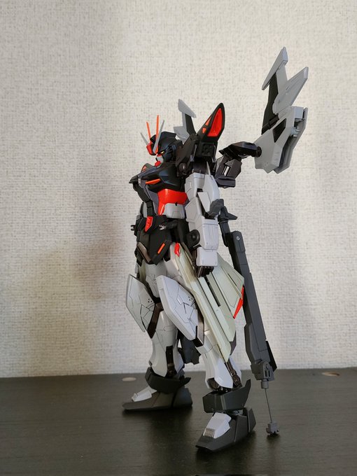 【ストライクノワール】 デカール貼り&コート終了です! 個人的な満足ポイントは、装甲(半光沢)と関節(光沢)のメリハリによるメタルビルドテイストと、重田顔にできたことです😎 きちんとした撮影は後ほど💦 #ガンプラの画像貼るとRTされると聞いて
