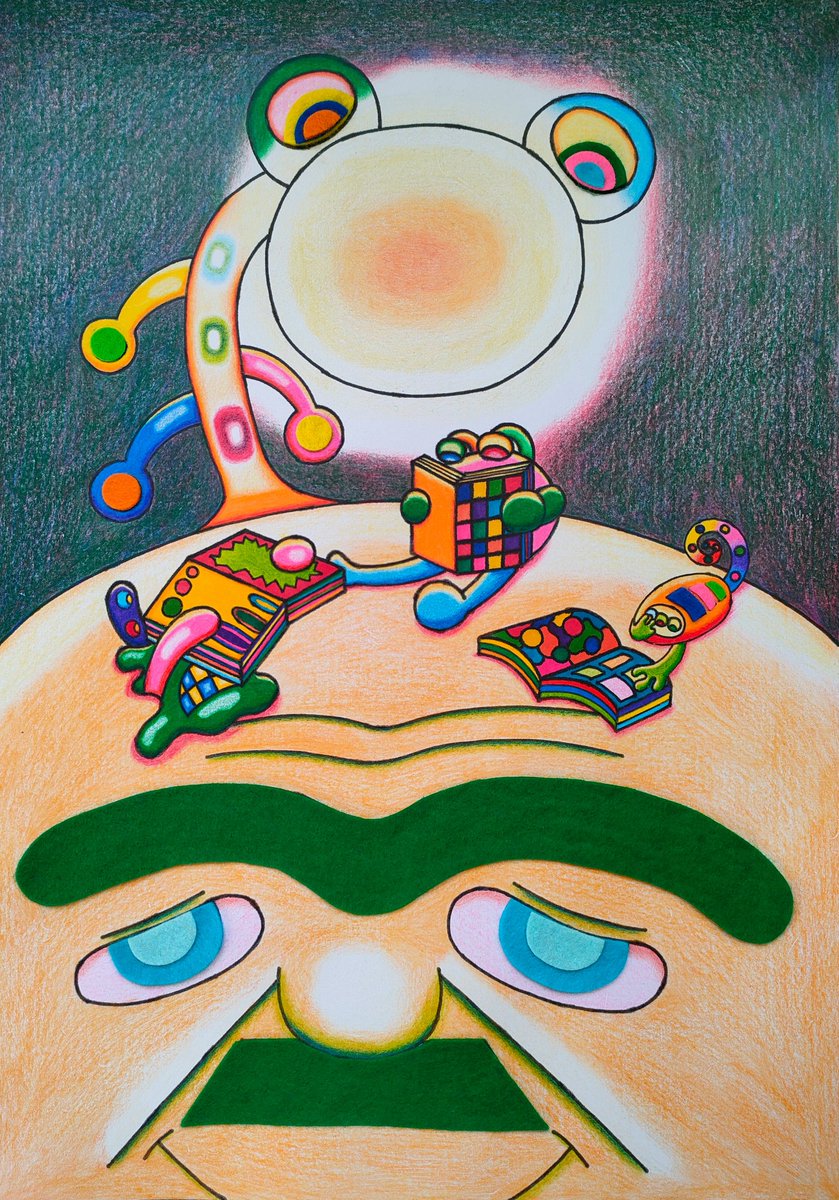1 7 おっちゃんの頭の上で本を読んでいます。 #イラスト #イラスト好きさんと繋がりたい #アート #芸術の秋 22/08/31 18:13