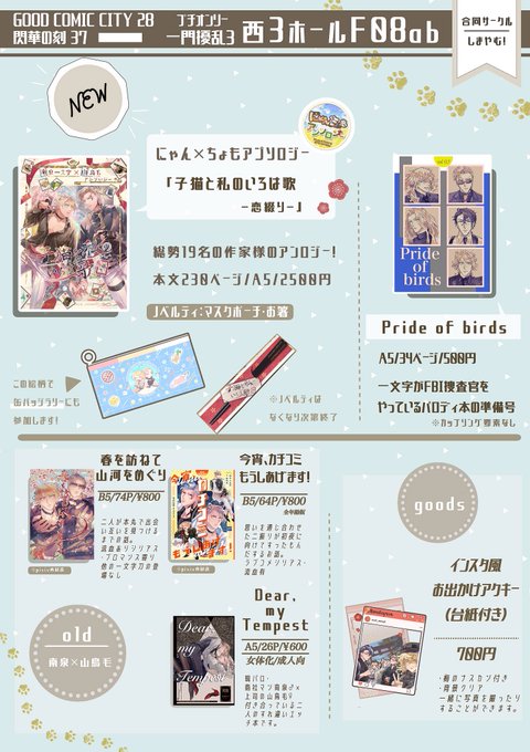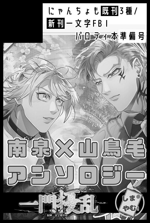 【8/28閃華37**一門擾乱】お品書き【西3ホール F08a】 | つつみ(はくじ) #pixiv pixiv.net/artworks/10077… 閃華のお品書きです‼️ 生まれたての にゃんちょもアンソロジーをよろしくお願いします〜! また個人誌はとうらぶの初CPなし本なので、そちらも楽しんで頂ければ嬉しいです〜
