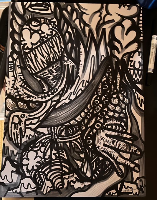 真っ白な紙をこんなにしてしまうって、少しやりすぎ。止まらないんだよ。だから油絵がやりい。画用紙が、限界になるからやめる。 #イラスト #ペン画 #変な絵 #落書き #どーした私