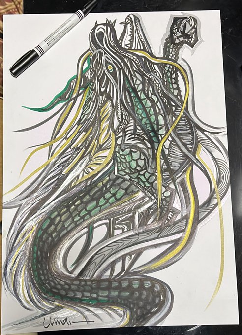 1 12 龍なのか、後ろ足忘れたけど、髭で誤魔化して( ̄□ ̄;)。 眠ぃ。眠気が来たから、終わりにする。 #お絵描き #イラスト #ペン画 #落書き #龍なのか妄想がほとんどッス 23/04/02 23:27
