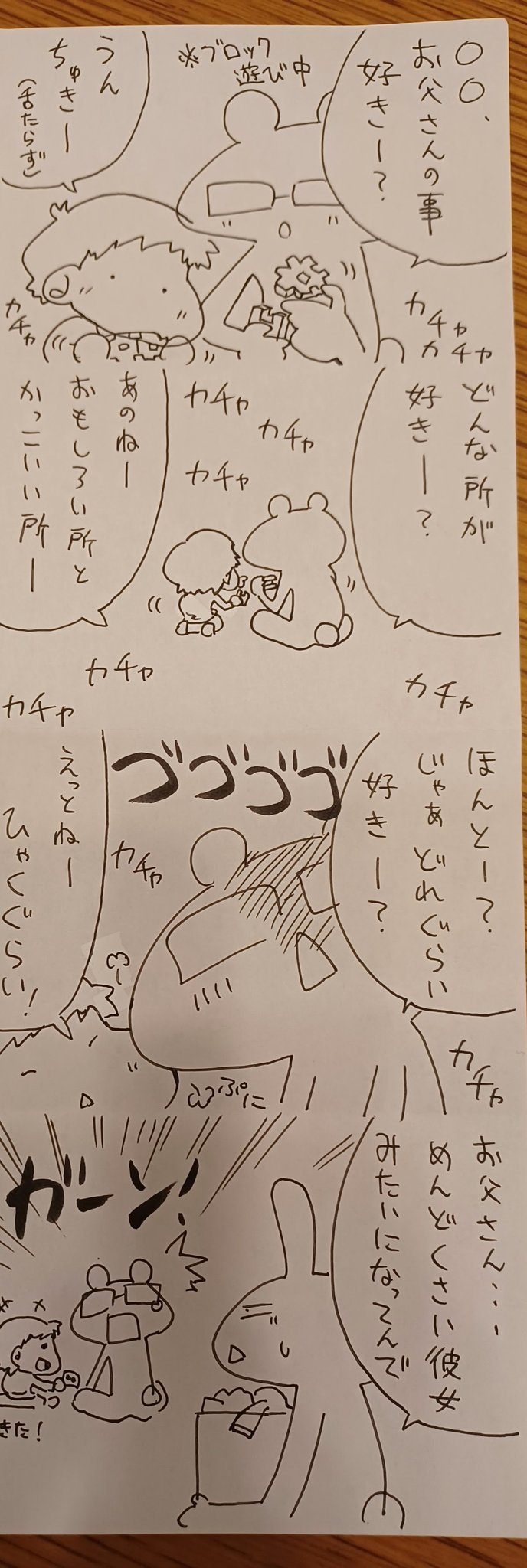 0 3 娘が喜んでくれてる間は、育児漫画を描いていこうと思いますが、娘に「描かないで!」と言われたら止めようと思います(´・ω・`) その場合はオリジナル漫画か、二次創作を描くしか!(笑) ……コミケ出るか!(`・ω・´) #落書き #イラスト #育児 #子育て #漫画 #4コマ 22/09/25 12:23