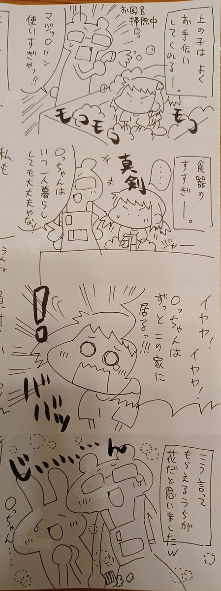 この前の休みの日は、雑巾がけを手伝ってくれました☺️ 「学校でも掃除の時間にやってんねんで!」 そやな。でも、お父さんはホウキ係が好きやったで。楽だから😋 #落書き #イラスト #育児 #漫画 #4コマ #子育て