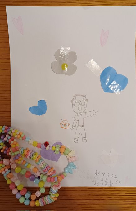 1 3 娘から似顔絵とネックレスをもらいました! 「おとうさんいつもしごとおつかれ」と描いてあるのが可愛い☺️ #落書き #イラスト #育児 #子育て 22/12/30 17:46