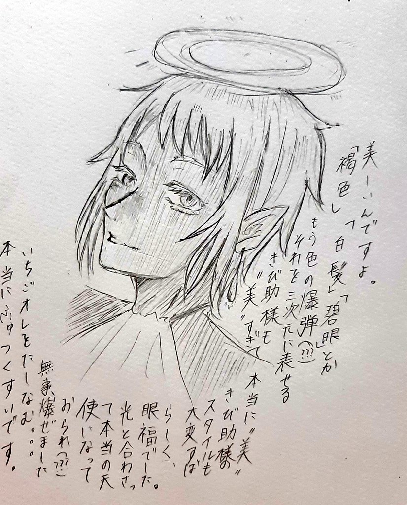 1 31 @kuuma_hoseki 様の創作の天使さまなんですけど、イラスト描いて良いとの事で、描かせていただきました。 画力が足らない上に落書きのようなレベルで本当に申し訳ないんですけど、 設定が好きすぎです。って言うことで…… 21/08/29 21:53