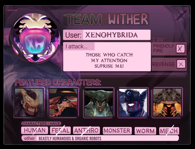 ~ So lets try this cant guarantee attacks backs but will try my best gonna keep uploading characters so stay tuned. #Artfight2022 #ArtFightTeamWither #oc ✧・゚: *✧・゚: artfight.net/~Xenohybrida ✧・゚: *✧・゚: