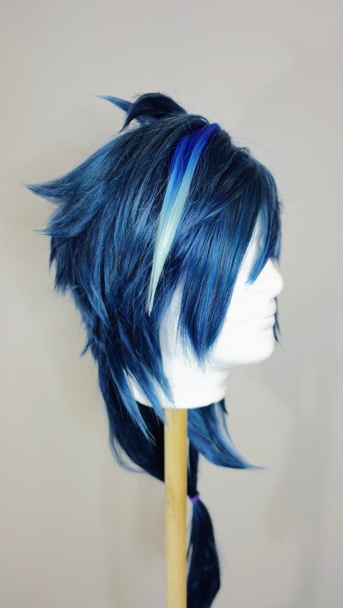 Kaeya's wig is done! Base is Arda Magnum Long Classic in Midnight Blue, sewed in some blue wefts for the ponytail and on the scalp to get a clean side part. The streaks are cool mint wefts that I airbrushed with a little blue to get a gradient. #cosplay #GenshinImpact #Kaeya