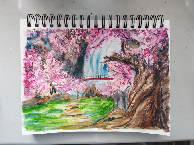 Watercolor scenery painting of peach blossoms. with a short video. 🙂🥰✌🌹🎉 #painting #watercolor #flowers #floralpainting #artistsontwitter #illustration #art #artist #blossom #landscape #pretty #nice #calm #cherryblossom #水彩画 #桃花 #桃林 #仙境 #风景 #video #youtube