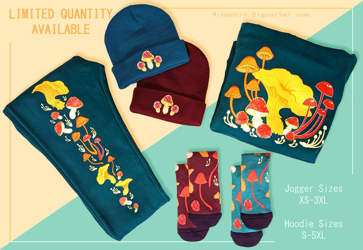 🍄MUSHROOM COLLECTION🍄 Available March 25th! Screen printed hoodie and jogger set, embroidered beanies, and socks! Stock is limited. Once their gone, their GONE! Don't miss launch, join my newsletter to be notified! xinophin.weebly.com