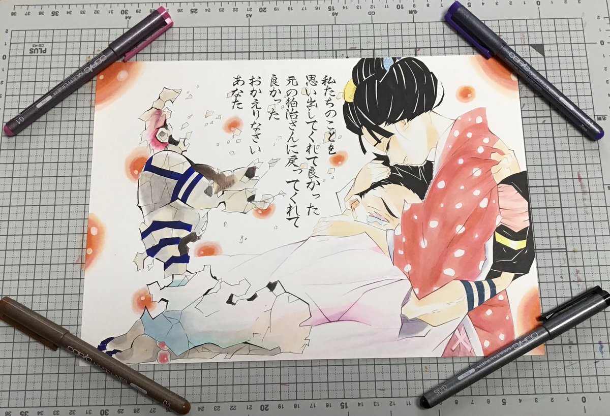 「私たちのことを思い出してくれて良かった。元の狛治さんに戻ってくれて良かった。おかえりなさい、あなた···」大好きなシーンを模写させて頂きました😍構図などはオリジナルです!良ければ沢山の方に見て頂きたいです😆 #鬼滅の刃 #模写 #コピック
