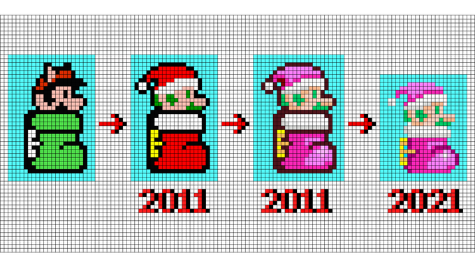 5 43 おはようございます。10年前にアレンジしたドット絵を再アレンジするなどしたアイロンビーザーです。よろしくお願いします #マリオ #ルイージ #クリスマス #ドット絵 #pixelart 21/12/11 05:37
