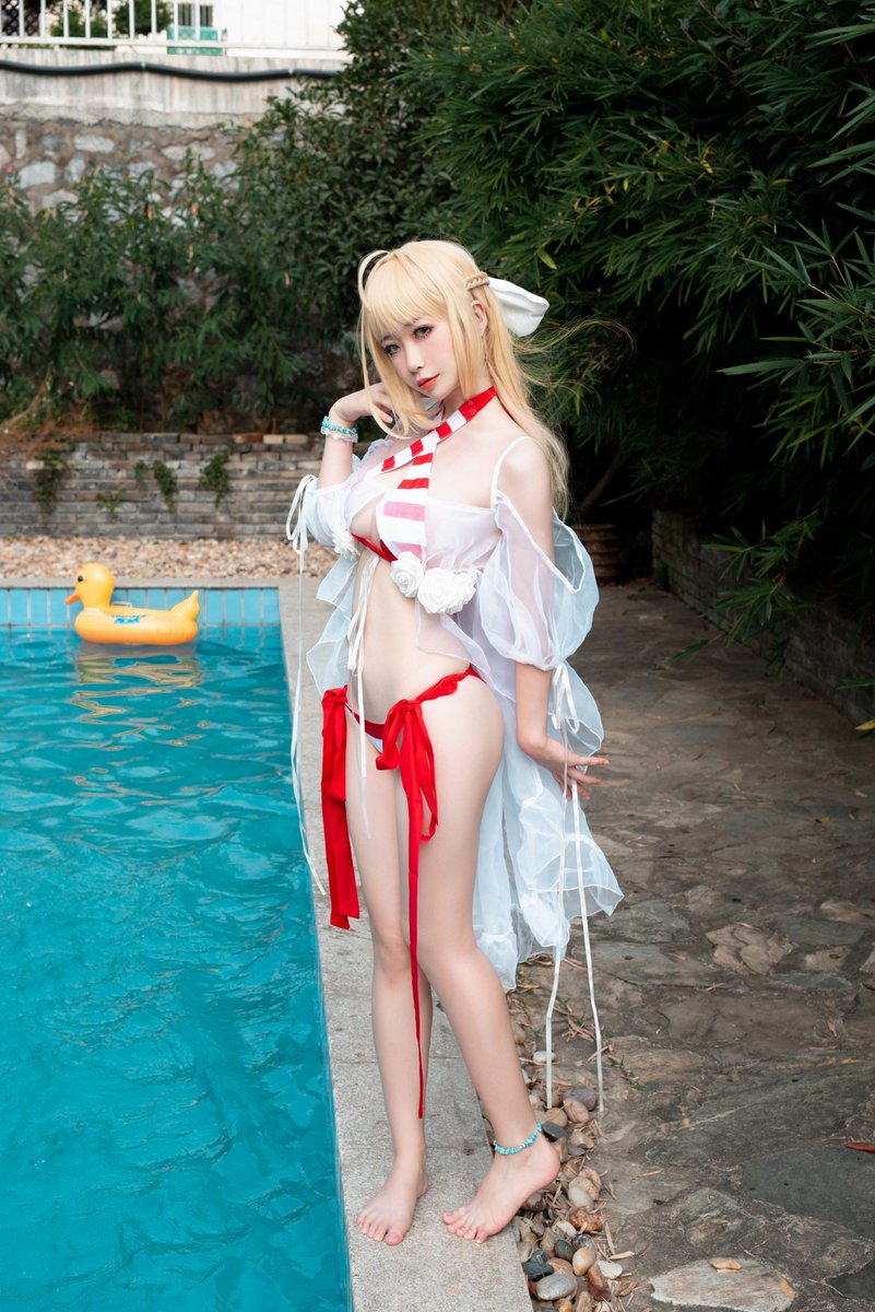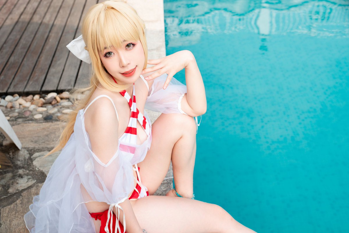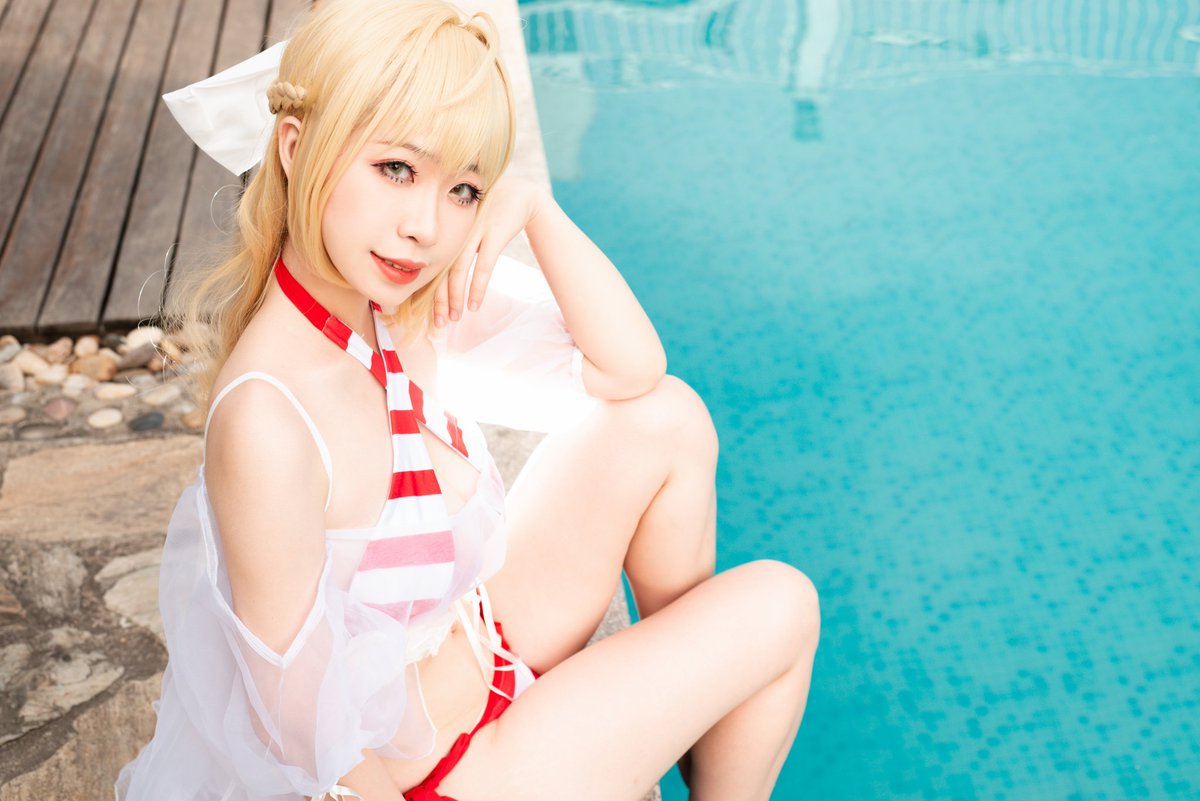 #FateGrandOrder #cosplay 尼禄泳装:本人 [在夏日的海洋闪耀七色光华~! 的说~! 映射的阳光乘着流淌的水流! 现在,要让余的歌剧响彻整个迦勒底!]