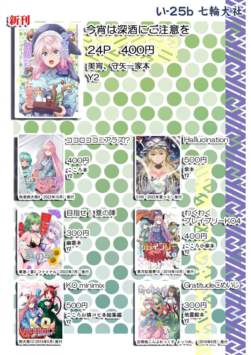 7 12 12/31 コミックマーケット101 2日目 西い-25b 七輪大社おしながきになります。 新刊は美宵ちゃんと鯢呑亭の常連、神奈子様を中心に 日常のひとときを描いたお話『今宵は深酒にご注意を』を頒布します。 よろしくお願いします! #C101 #C101お品書き #お品書き 22/12/28 23:10