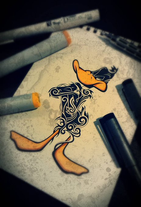 ルーニーの「ダフィー・ダック」 トライバルオマージュアート。黒塗りの部分をオリジナルトライバル化。 #トライバル #アナログ絵 #アート #イラスト #デザイン #オマージュ #ダフィーダック #二次創作 #daffyduck #looneytunes