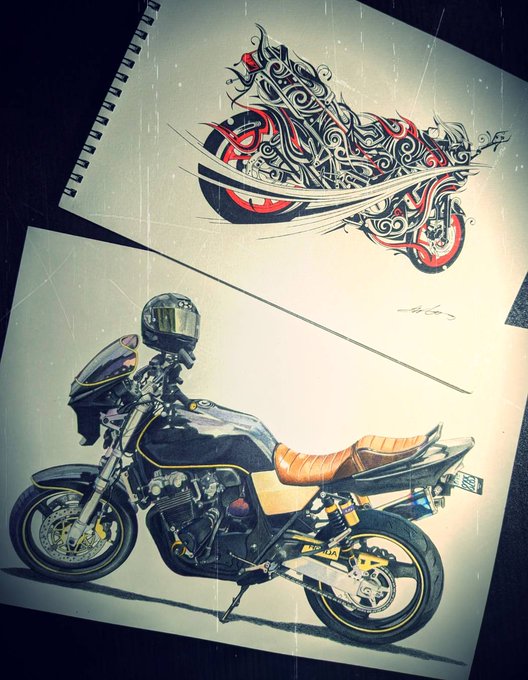 バイク乗り+絵描き同士で、お互いの愛馬を描き合って交換というスーパー素敵な企画をさせて頂きました! YuR!さんに心から感謝です! #トライバル #イラスト #バイク