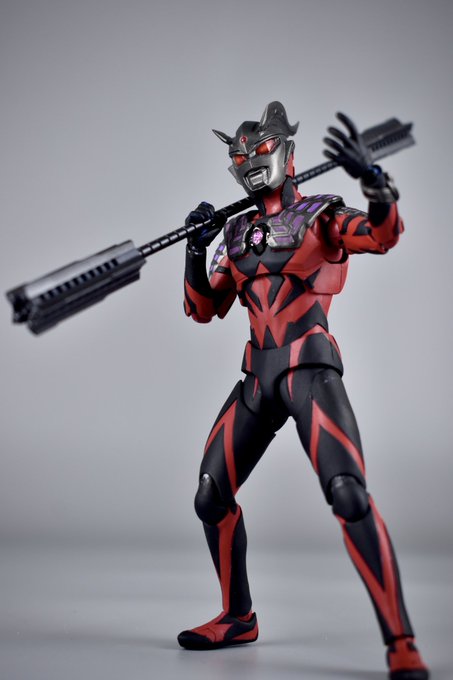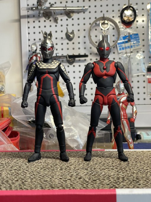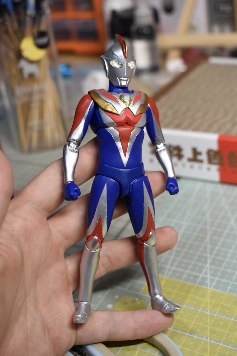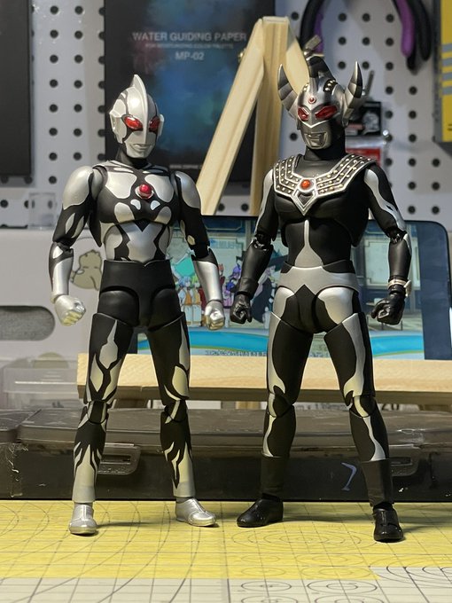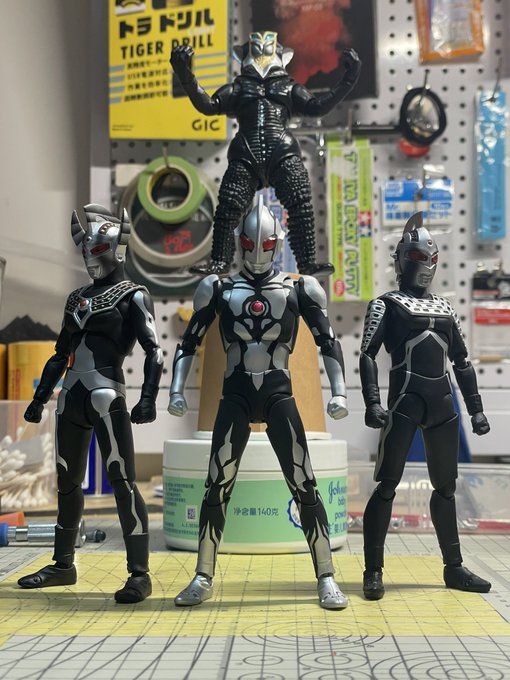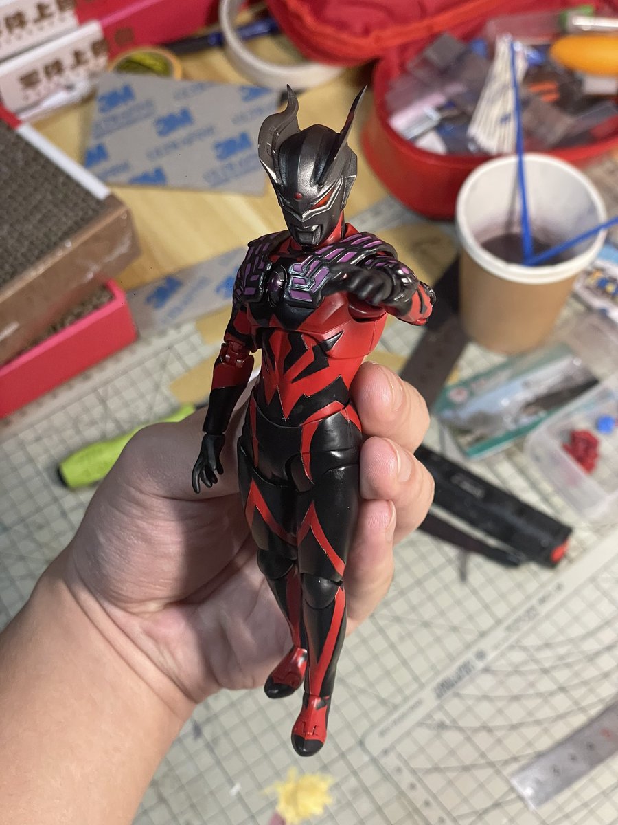 SHF重塗 卡歐斯U & 卡歐斯T 這兩個的花紋全都是遮蓋噴塗 只有卡欧斯U臉上的紋是手塗 原本卡欧斯U也是想跟皮套把黑眼圈噴出來 結果噴完發現線條太粗就換成遊戲那種實線筆塗 而卡歐斯T就是跟著皮套做的頭部線條 #ウルトラフィギュア改造同好会