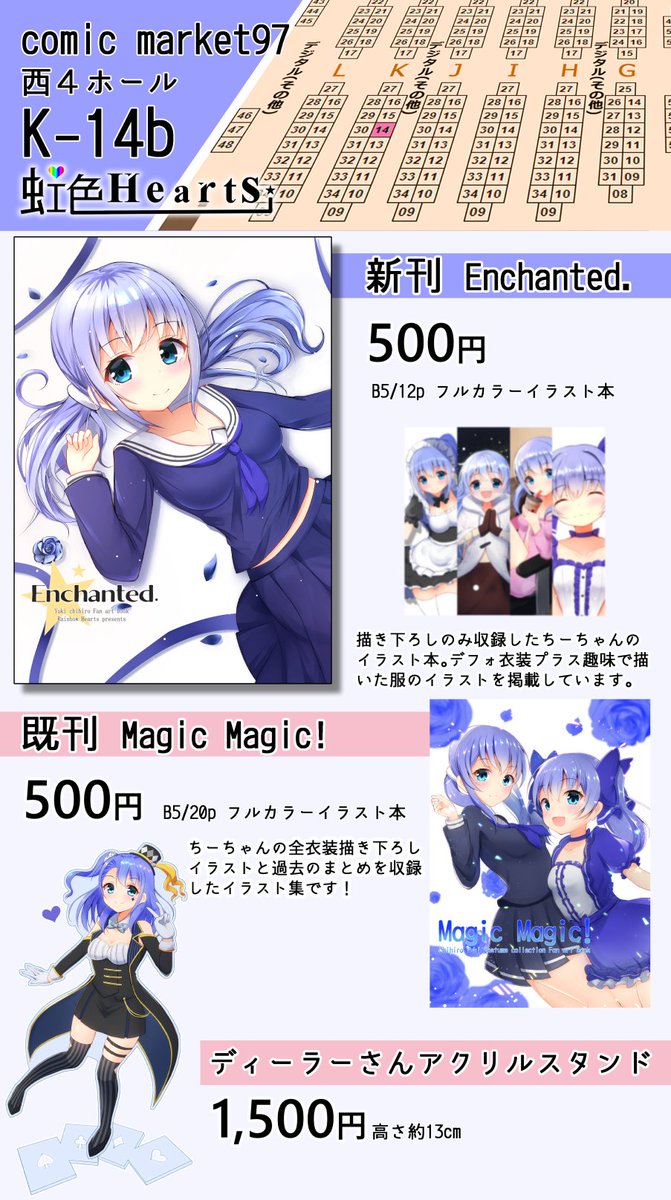 あなたのサークル「虹色Hearts」は、コミックマーケット97で「火曜日西地区 "K " 14b」に配置されました!コミケWebカタログにてスペース配置場所公開中です! webcatalog.circle.ms/Circle/Map/148… #C97WebCatalog 受かってました~!イラスト本とかグッズとか作ります!