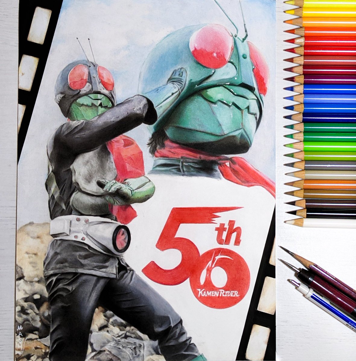 色鉛筆で「仮面ライダー1号 桜島ver」描きました!!!!!!!! 50周年少し過ぎてしまいましたが、50周年記念的な感じのイラストに仕上げました!! おめでとうございます!!!! 🎉🎉🎉🎉🎉🎉🎉 (一部修正再投稿っす) #色鉛筆画 #イラスト #仮面ライダー #仮面ライダー50周年