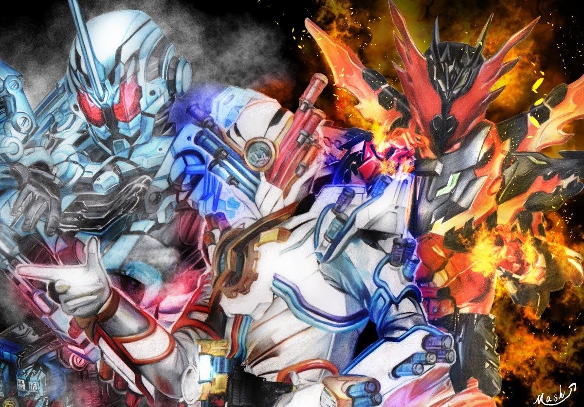 「モチベ上げるために過去絵を振り返る」 ⑤α ビルドライダーズ(エフェクトver) クリスタで色鉛筆画にエフェクト足してみたやつ。 結構かっこよく仕上がってんじゃね?って気に入ってる(特にクローズマグマの熱々感)