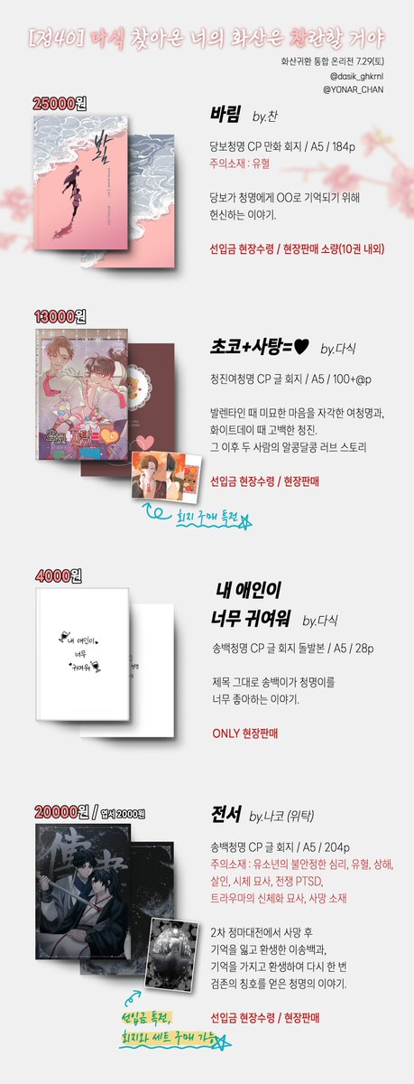 RT=❤️ 🌺화산귀환 통합 온리전 부스 인포🌺 [정40] 다식 찾아온 너의 화산은 찬란할 거야 다식(@ dasik_ghkrnl)님과 함께 하는 반부스이며, 나코(@ dear_my_x0)님의 회지 위탁판매도 합니다. 잘 부탁드립니다 😊 #화산귀환 #우강정 twitter.com/i/web/status/1…