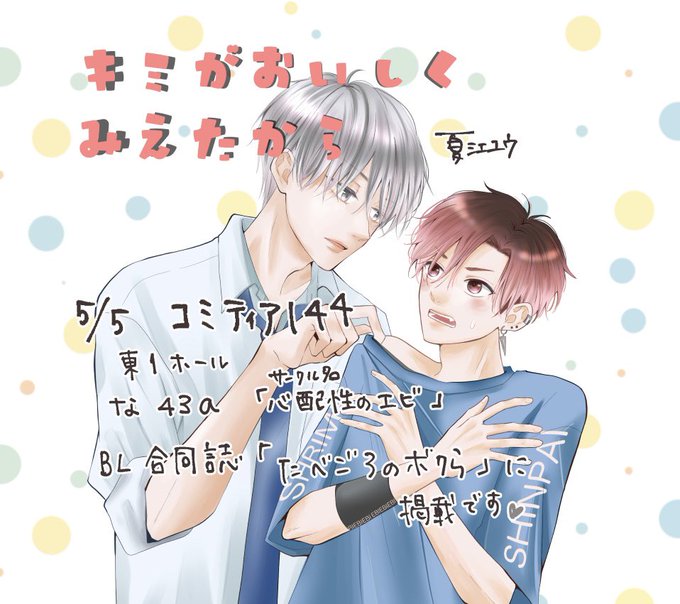 4 12 5日後!のコミティア144で出すBL合同誌📖 わたくし夏江はこんな2人を描きました🌟 通販も予定してますので、お手に取っていただけたら嬉しいです😊 23/04/30 09:48