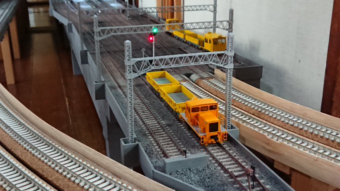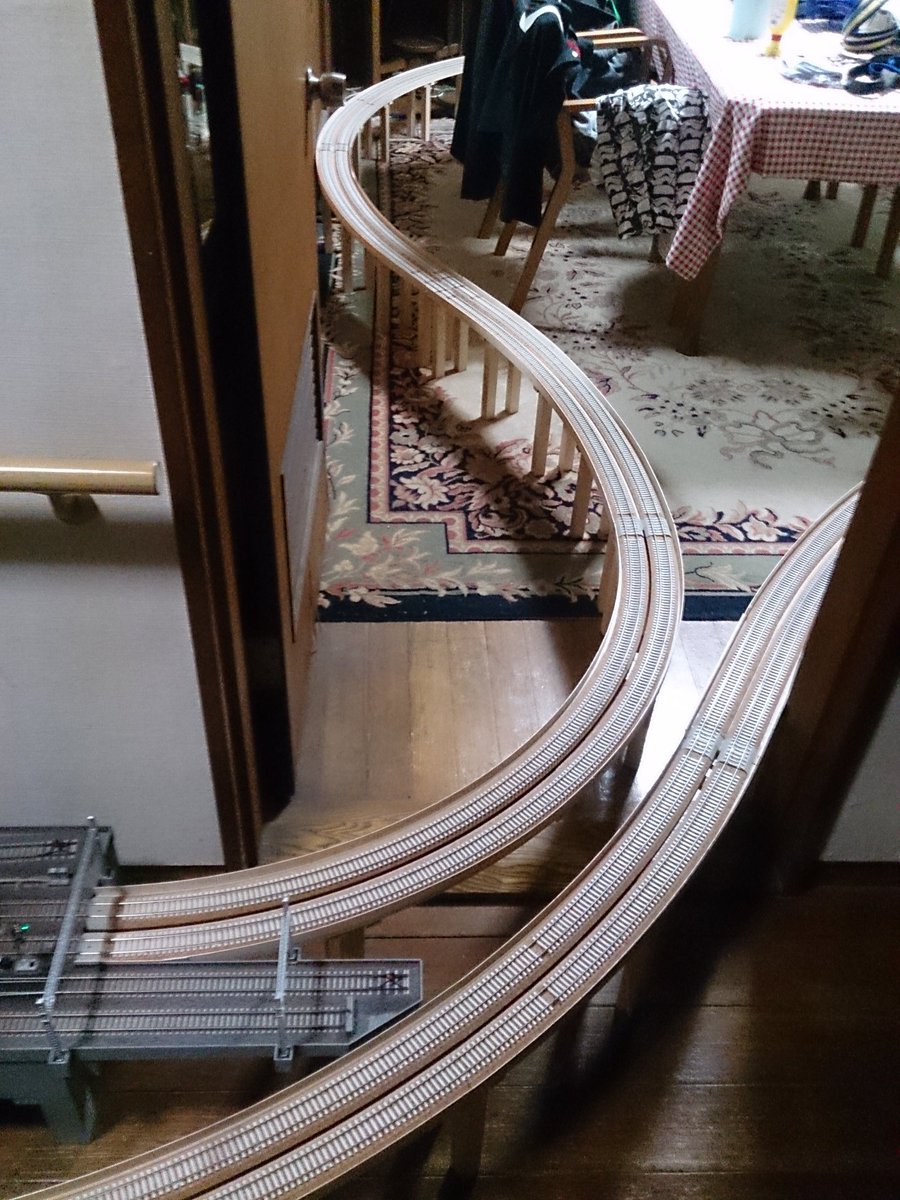 352 1000 16番レイアウトは流石に一部屋では収まりきらず、廊下を伝って別の部屋を周回して戻る感じ。かなり苦肉の策半固定組立式モジュールレイアウトといったところ。1周約30m。曲線は最急カーブで約R800、最緩カーブで約R2000。この組立設置と撤収にかなりの手間がかかるのが泣き所。 17/02/03 00:27