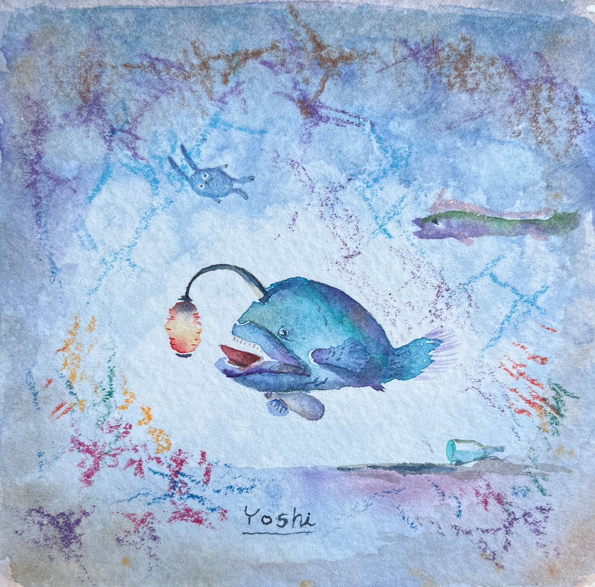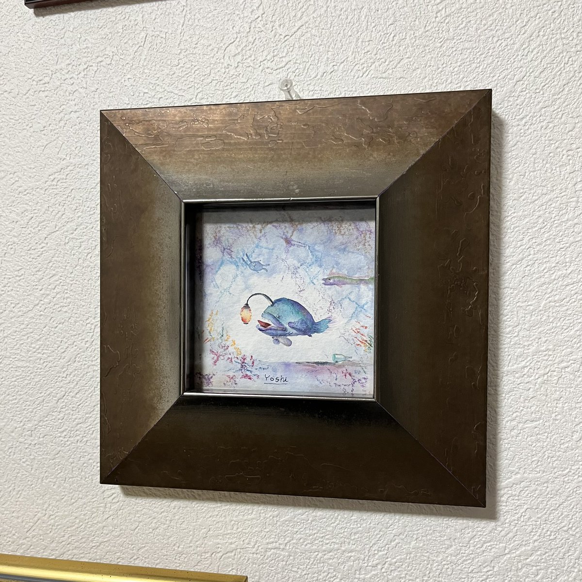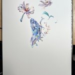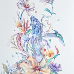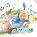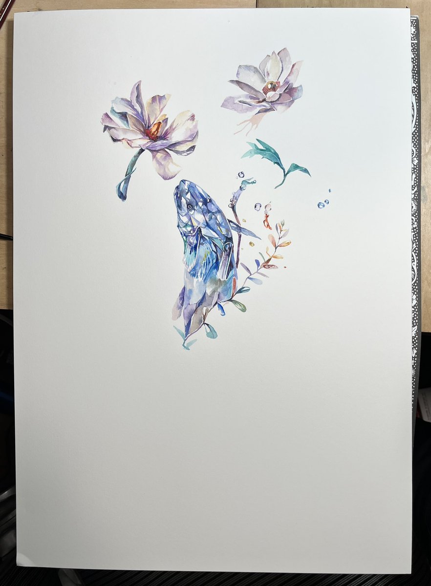 深海魚のシーラカンスが草花や水滴と共にある感じです。 今回使ってる紙は36×51センチと、けっこう大きいサイズです。 でも使う筆は面相筆や0号の細筆がメイン。チマチマと描いていきます。 #透明水彩 twitter.com/ysilverquick/s…
