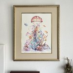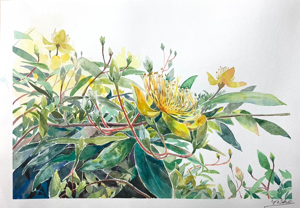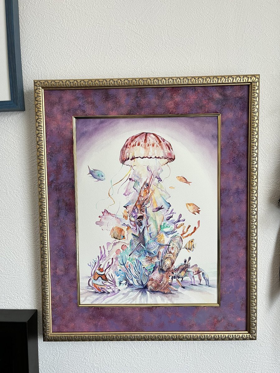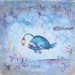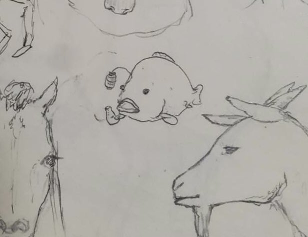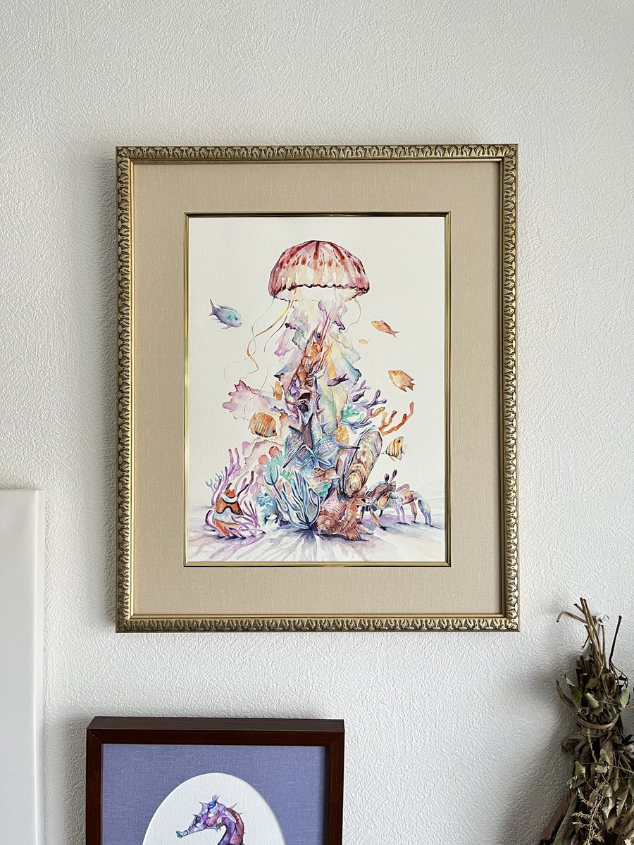 深海魚のシーラカンスが草花や水滴と共にある感じです。 今回使ってる紙は36×51センチと、けっこう大きいサイズです。 でも使う筆は面相筆や0号の細筆がメイン。チマチマと描いていきます。 #透明水彩 twitter.com/ysilverquick/s…