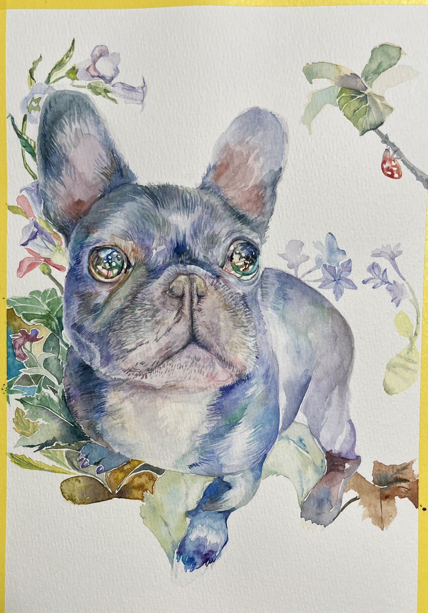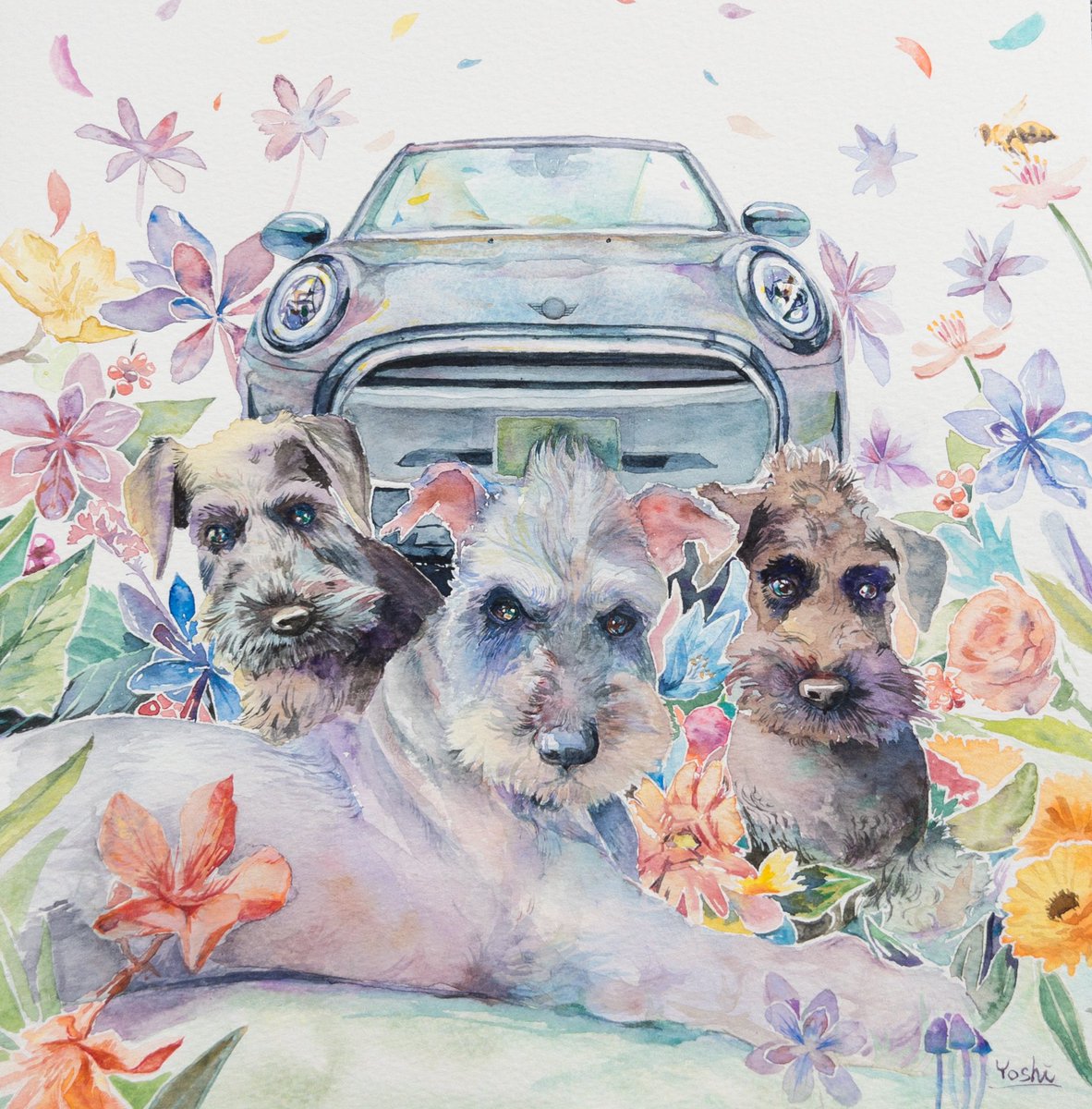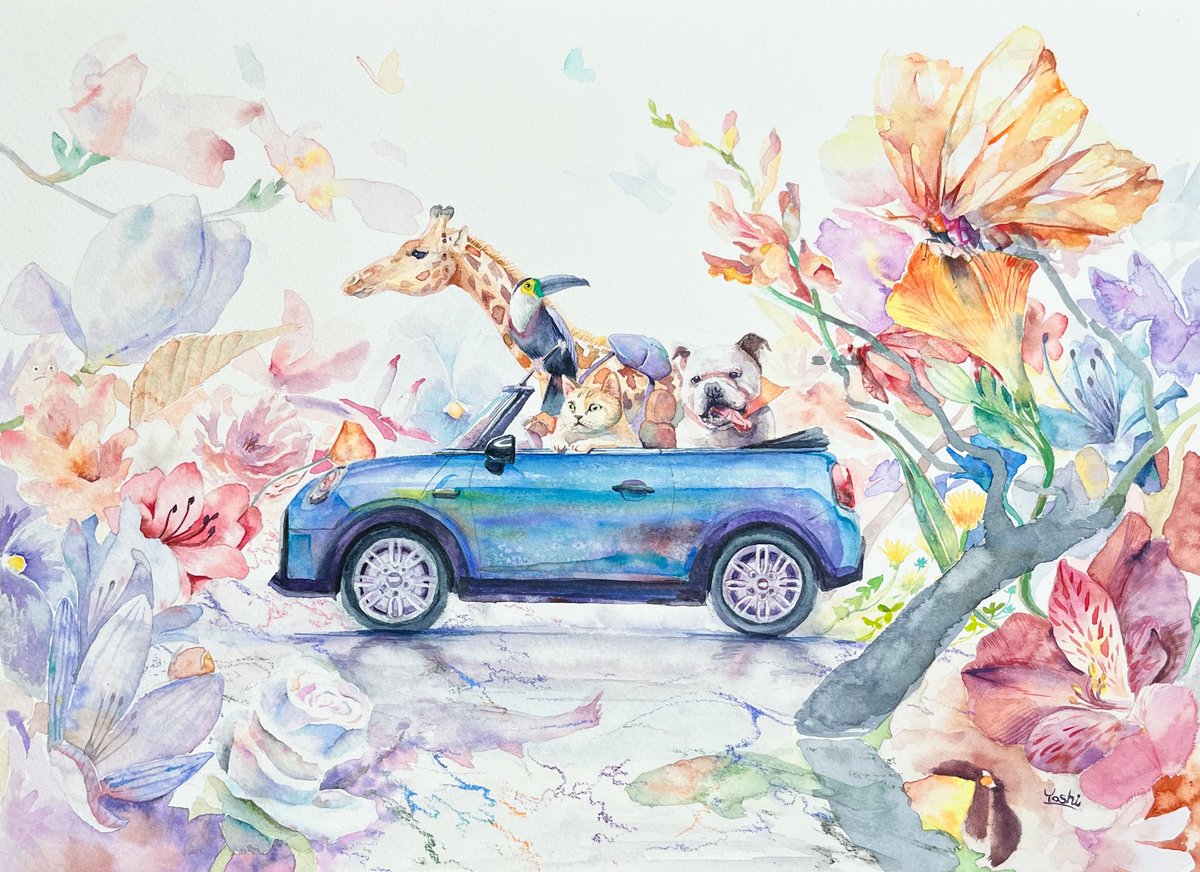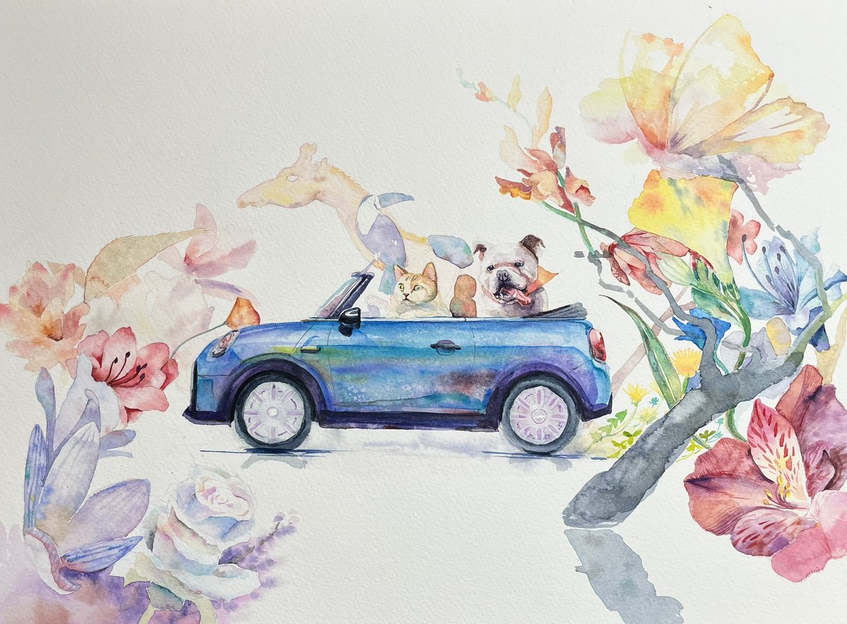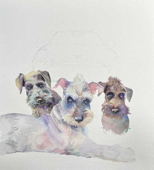 描き進めてます。 車と小型犬だと、大きさが違いすぎて一緒に絵に入れるにはどうしたらいいか、と考えた末の配置です。 ここで大事なのは、大きさや距離感が正確であることではなく、犬、車の両方が映えること。 (映えるかなぁ…と常に不安に思いながら描いてます😂) #透明水彩 twitter.com/ysilverquick/s…