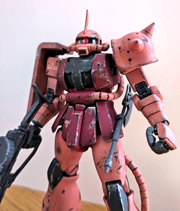 HGのシャアザクを、原型色台無しカラーで仕上げました笑 デカール貼るか悩んだけど、今回はあえてウェザリングだけで😃 デカール貼った方が良かったかな?? #ガンプラ