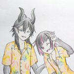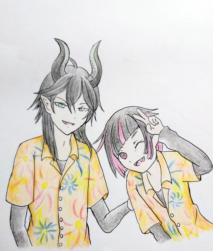 #ツイステファンアート #アリアーブナーリア #マレウス・ドラコニア #リリア・ヴァンルージュ 「束縛から解き放たれし者が纏う自由の衣」(ジャーニーシャツ)を着たマレウスとリリアの絵が話を見てて描きたくなったので描いてみた(。・ω・。)(長女)