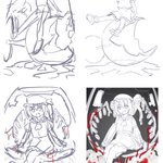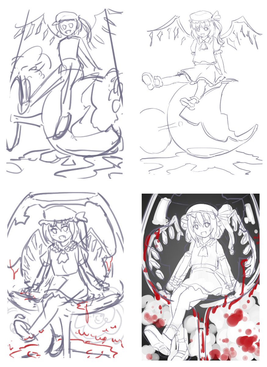 #このタグを見た人はラフ画とその完成絵を見せる 最初に割れたワイングラスに座るアイデアを思いついたのがいいけど実際にラフを描いてみると可愛くないと思って諦めて没にした 後でもう一回粘ろうと思って何とかできた