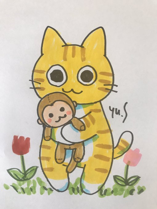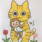 今日はサルか!おさるの絵が見つからなかったので今描きました。なぐりがきですいません。このねこちゃん、おさるのぬいるぐみが大好きなんだって。 #ひとさじの祈り