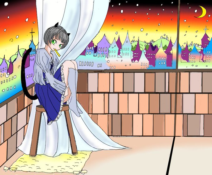 皆様お疲れ様です😊 とりあえず完成! 「部屋と猫」くわえてるのはチュールのつもり🐱´-`) #デジタルイラスト