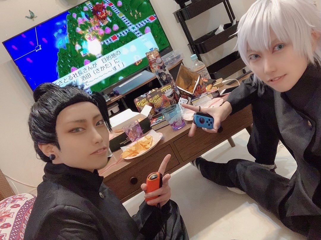 cos*1着目🍑🚃ついにやってしまった傑と悟!さしすで桃鉄99年やったよ!!!(半分ウソ)硝子はラーメンで一生稼いでるし、どうして悟しか目的地に辿り着けないんだ?!?!??初めてなのに??初見プレイの悟にどうして負けたんだ????最強の男はゲームでも最強だった… 五条悟(あを) 夏油傑(ゆの)