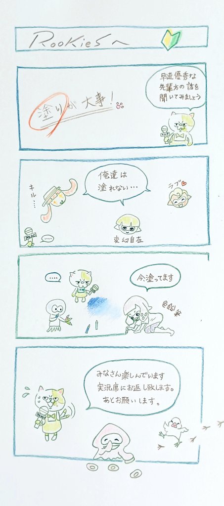 4 25 今回も色鉛筆で、楽しく参加させていただきました。四コマ初挑戦🔰 オチがない=水に落ちないという隠れたメッセージがあるとかないとか、、、(…ないです。四コマ難しい💦) #イカすクリエイター #PACAOCUP #色鉛筆 22/03/14 20:10