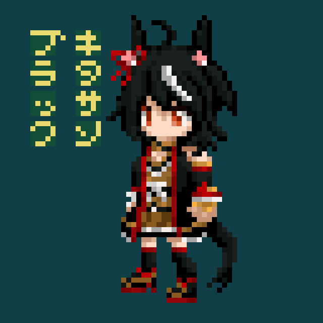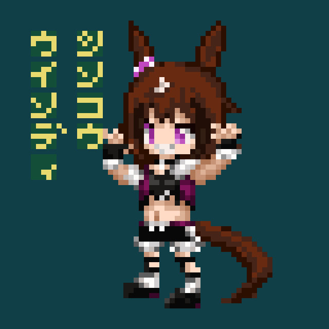キタサンブラック!!困った人はほっておけない元気で明るいお祭り大好きウマ娘。サトちゃんとは仲良しでライバルな存在。テイオーに憧れる。体重がもりもり成長中なのが何か可愛い☆ #ウマ娘 #ドット絵