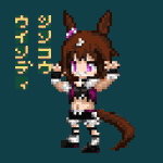 シンコウウィンディ(勝負服ver)。実装記念☆前に制服版を描いたけど、勝負服が出たので☆待機ポーズの指をくわえているポーズは可愛すぎる。お腹出してもいいのだ!!悪の王になるのだ☆お腹のはスペアの牙なのだ!! #ウマ娘 #ドット絵