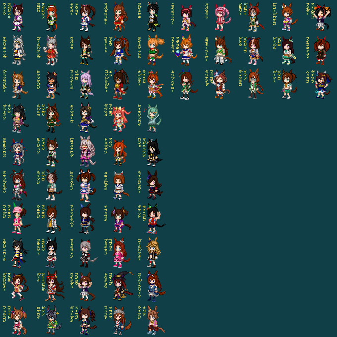 75人揃った。そろそろ実装されてない子も出てき始めてなんなら勝負服がない子も増えてきた。そんな子はとりあえず制服で描きます。全員描くまでに制服何人に増えるかな~。 #ウマ娘 #ドット絵